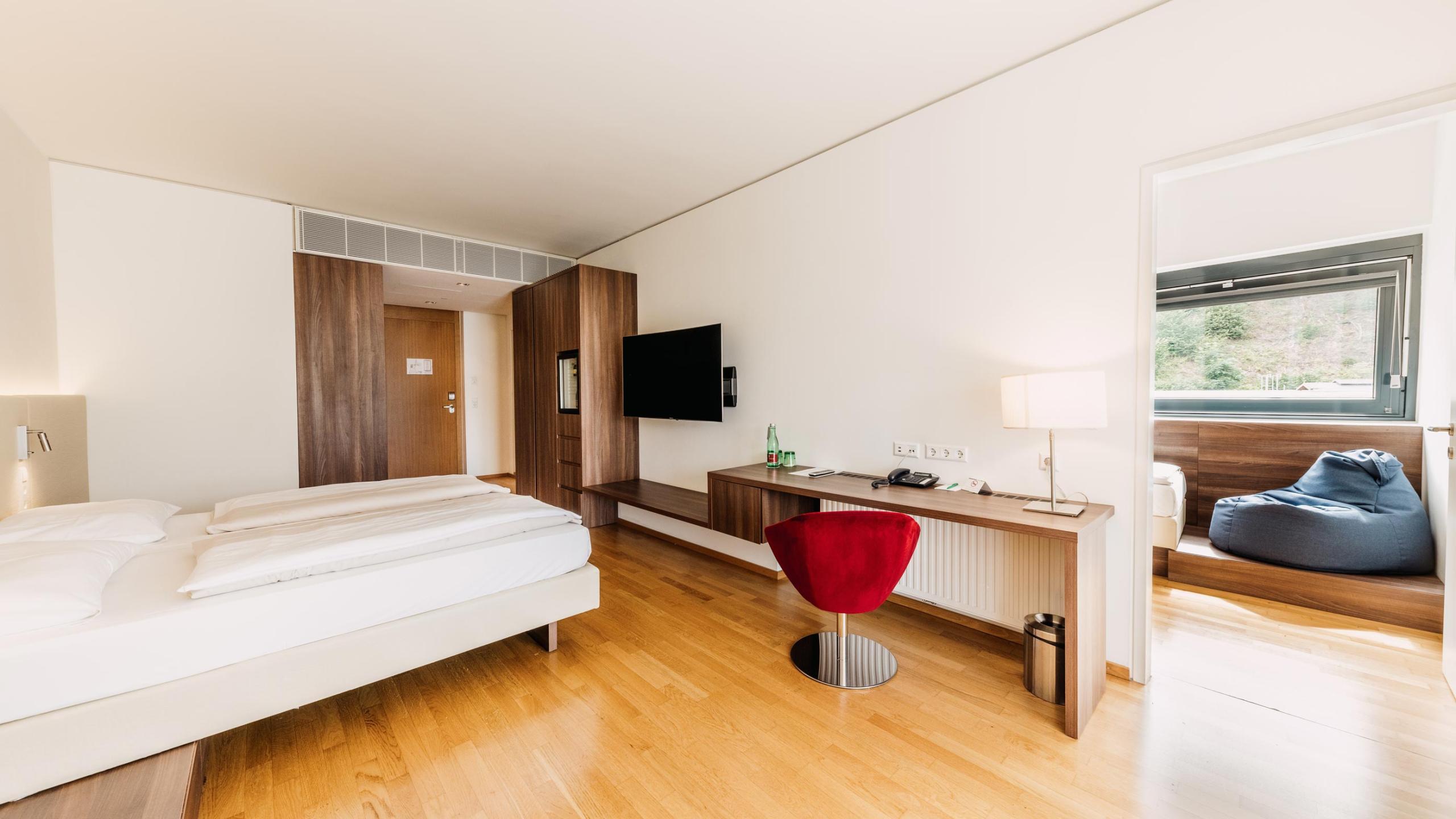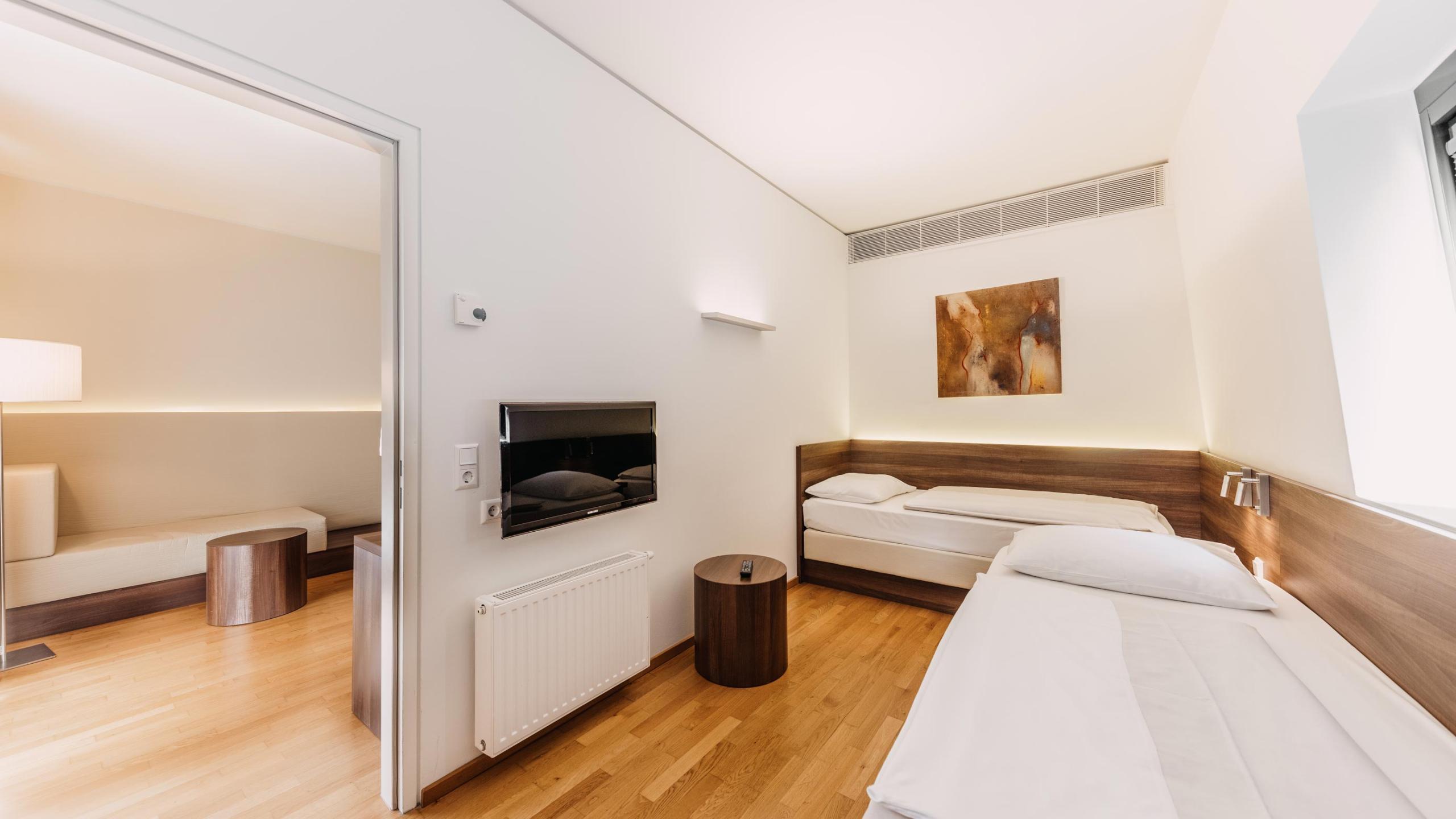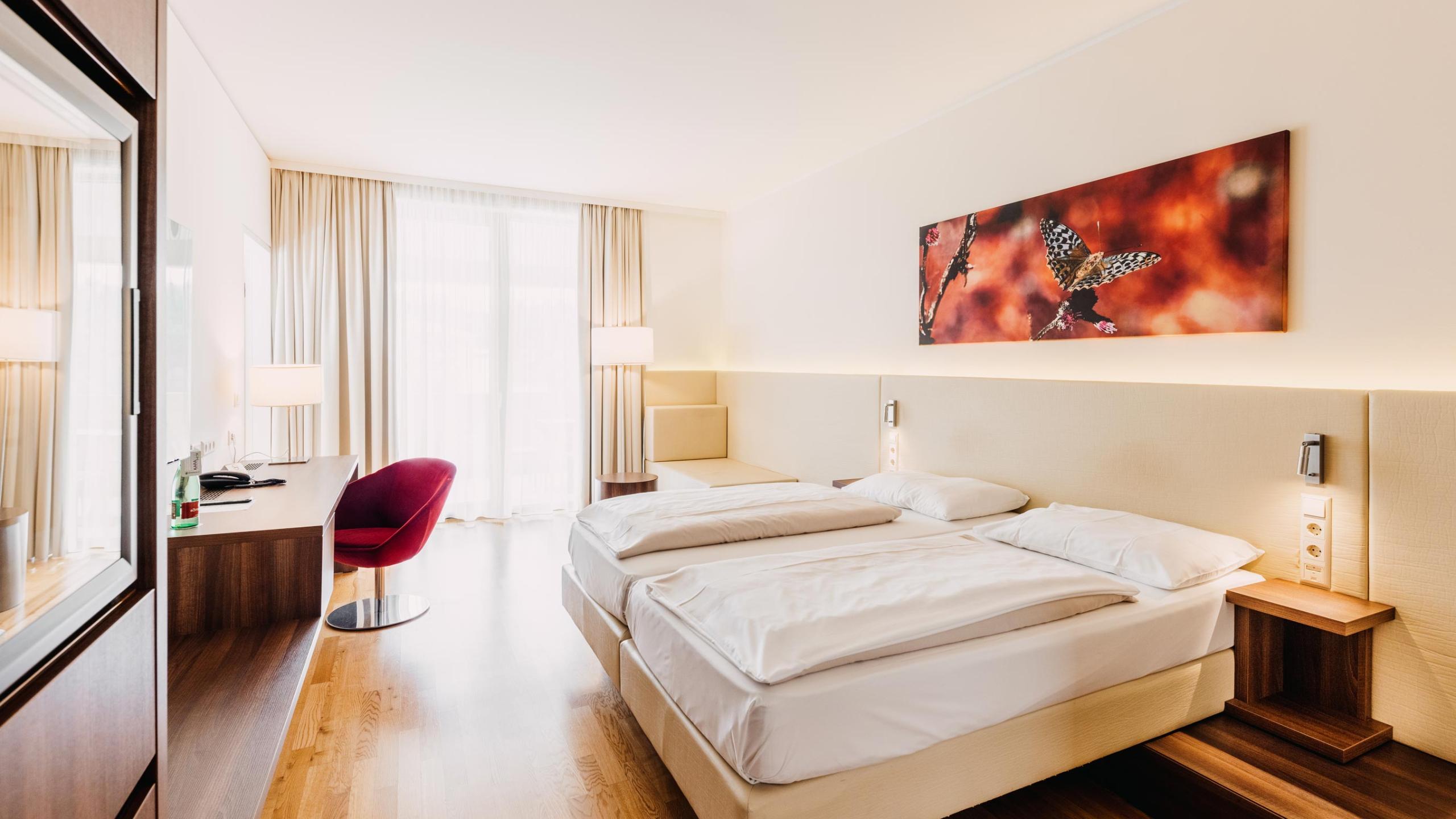 Each room is equipped with flatscreen TV. Parquet floor. With large balcony and view of the KärntenTherme and the Warmbaderhof. Bathroom with shower and bathtub, WC, hairdryer and make-up mirror, flatscreen TV, radio, desk, WLAN, telephone, safe, minibar.