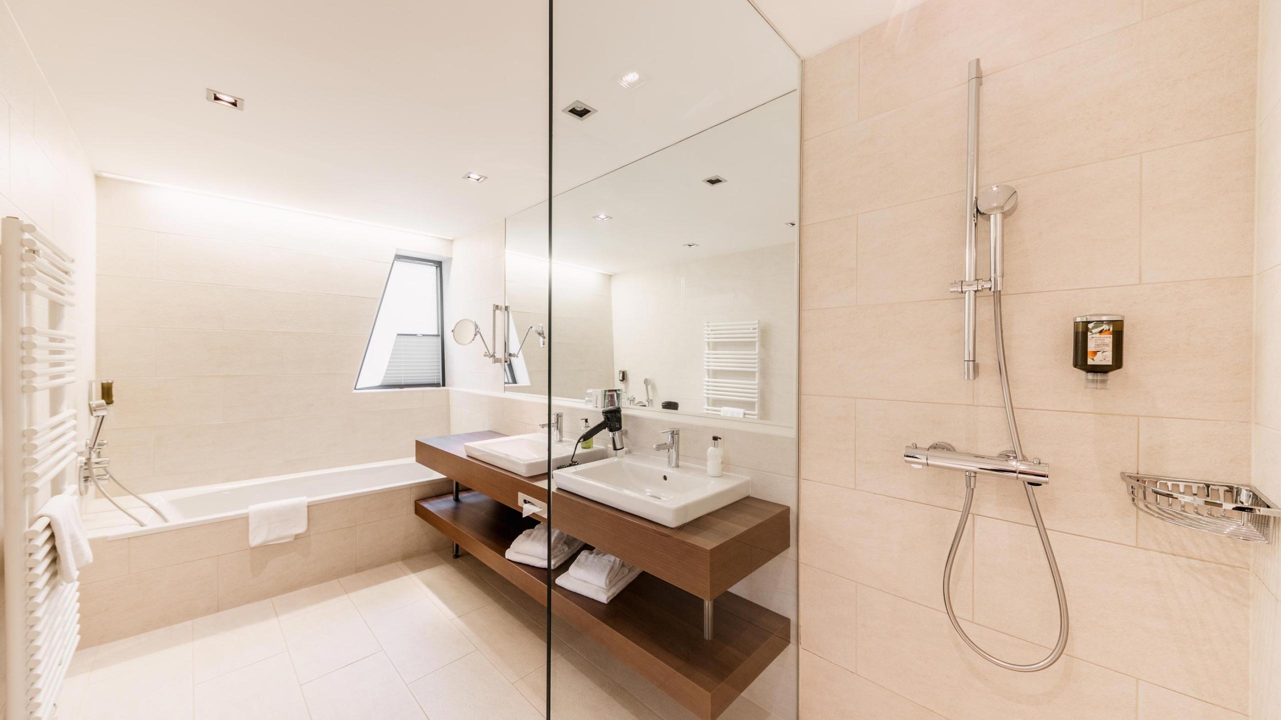 Badezimmer mit Dusche und Badewanne, WC, Haarföhn und Kosmetikspiegel, Schreibtisch Flatscreen TV im Wohnraum, Radio, WLAN, Telefon, Safe, Minibar.